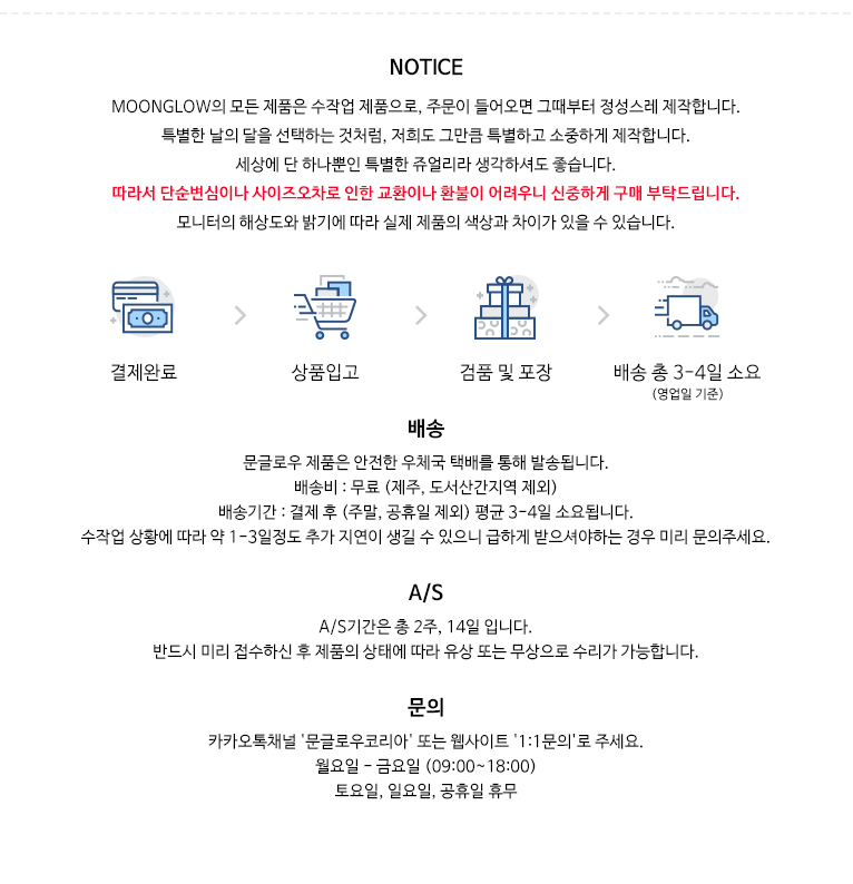 - 거래처 사정으로 인한 입고지연 및 제작기간 소요로 인해 부득이한 배송지연이 있을 수 있습니다. (이 경우, 개별적으로 연락을 드립니다.)